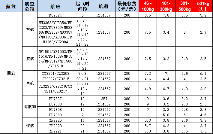 | 航线 | 航空公司 | 航班 | 起飞时间段 | 航期 | 最低收费(元/票) | 46 -100kg | 101-300kg | 301-500kg | 501kg 以上 |