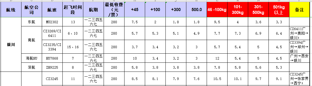 广州白云机场货运部,广州到银川空运价格表,此飞机价格托运表仅为参考,具体请致电广州白云机场货运部广空当日达服务电话4009218126咨询!(可添加客服微信15360896756)